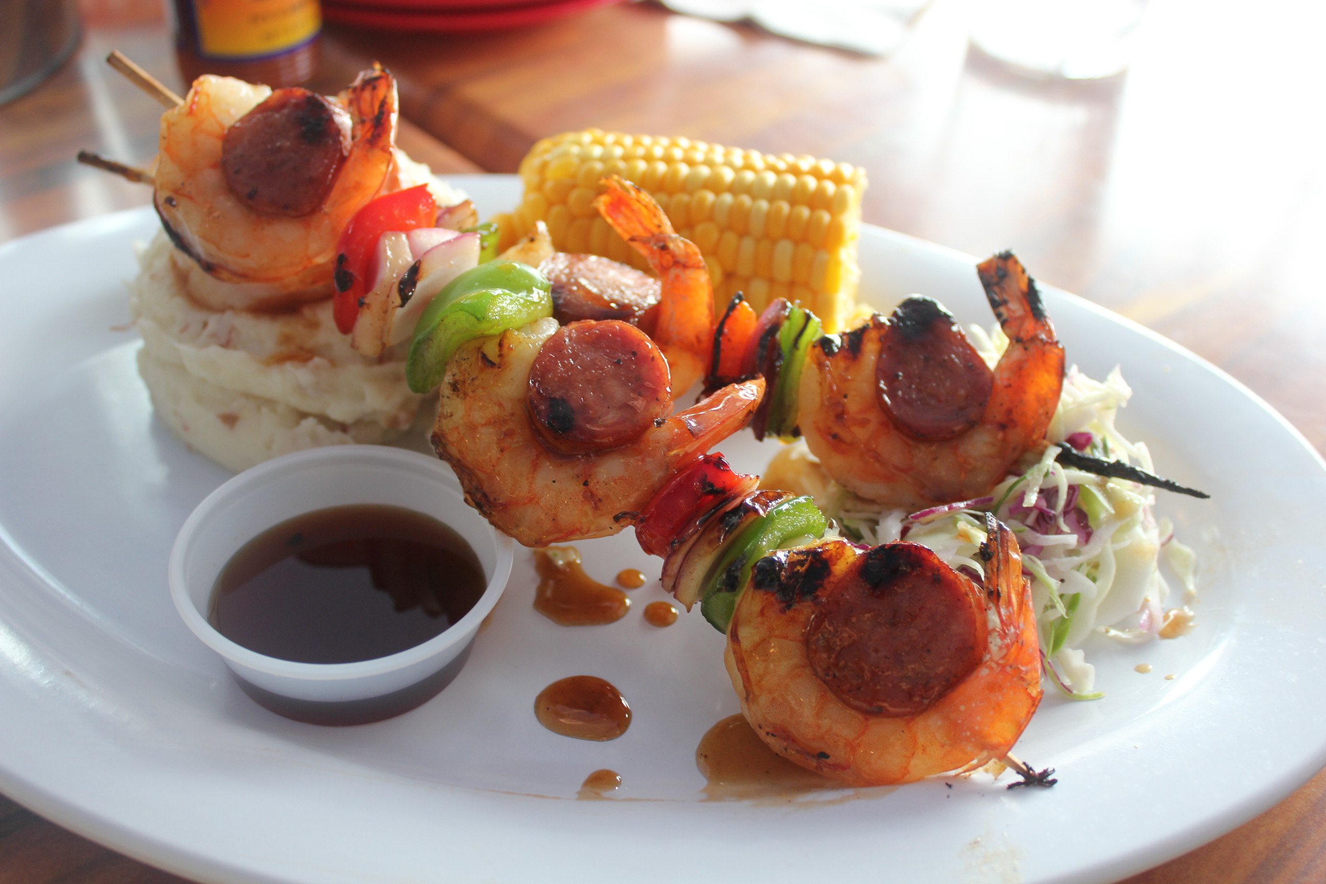 Huck ordered the Bourbon Glazed Shrimp Skewers with Mashed Potatoes, Corn, and Slaw. He really liked his lunch too.