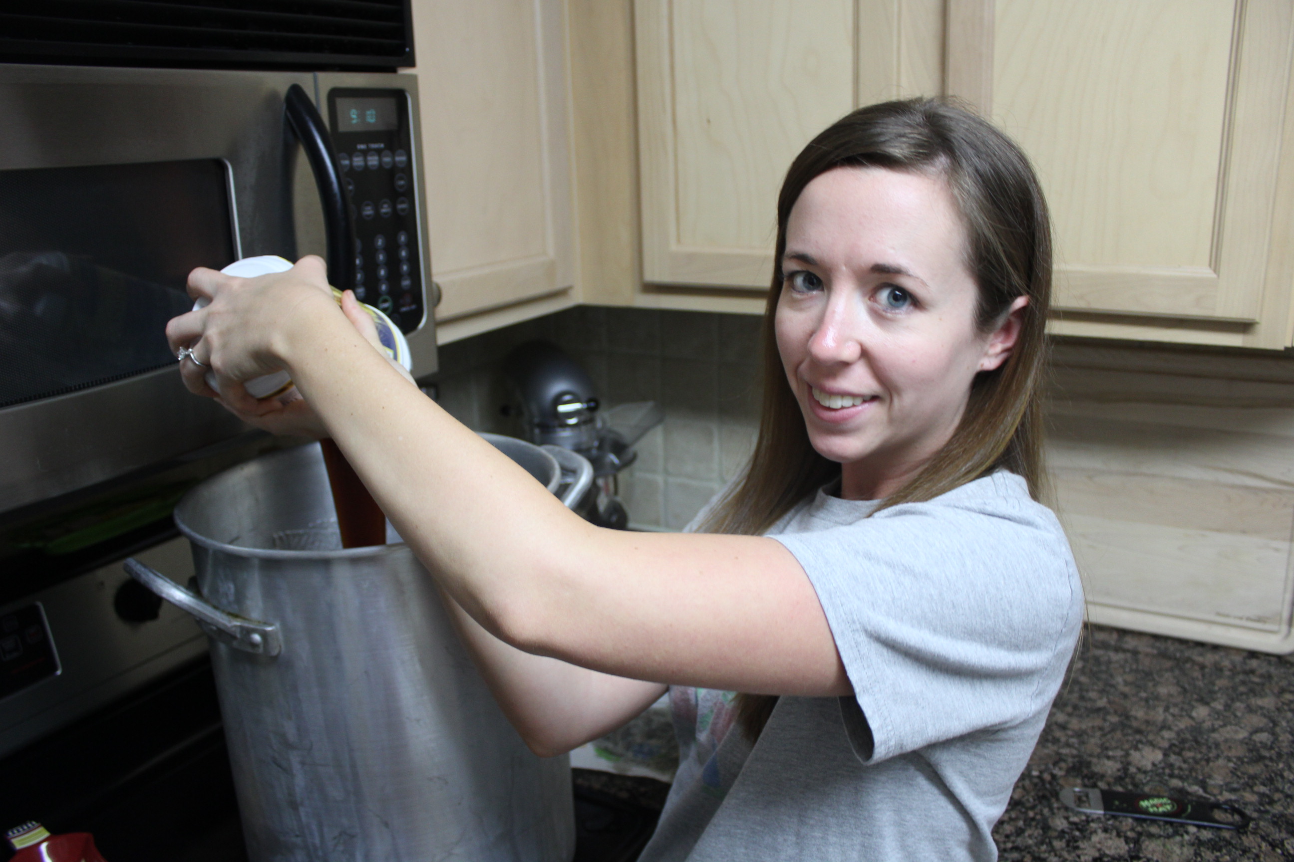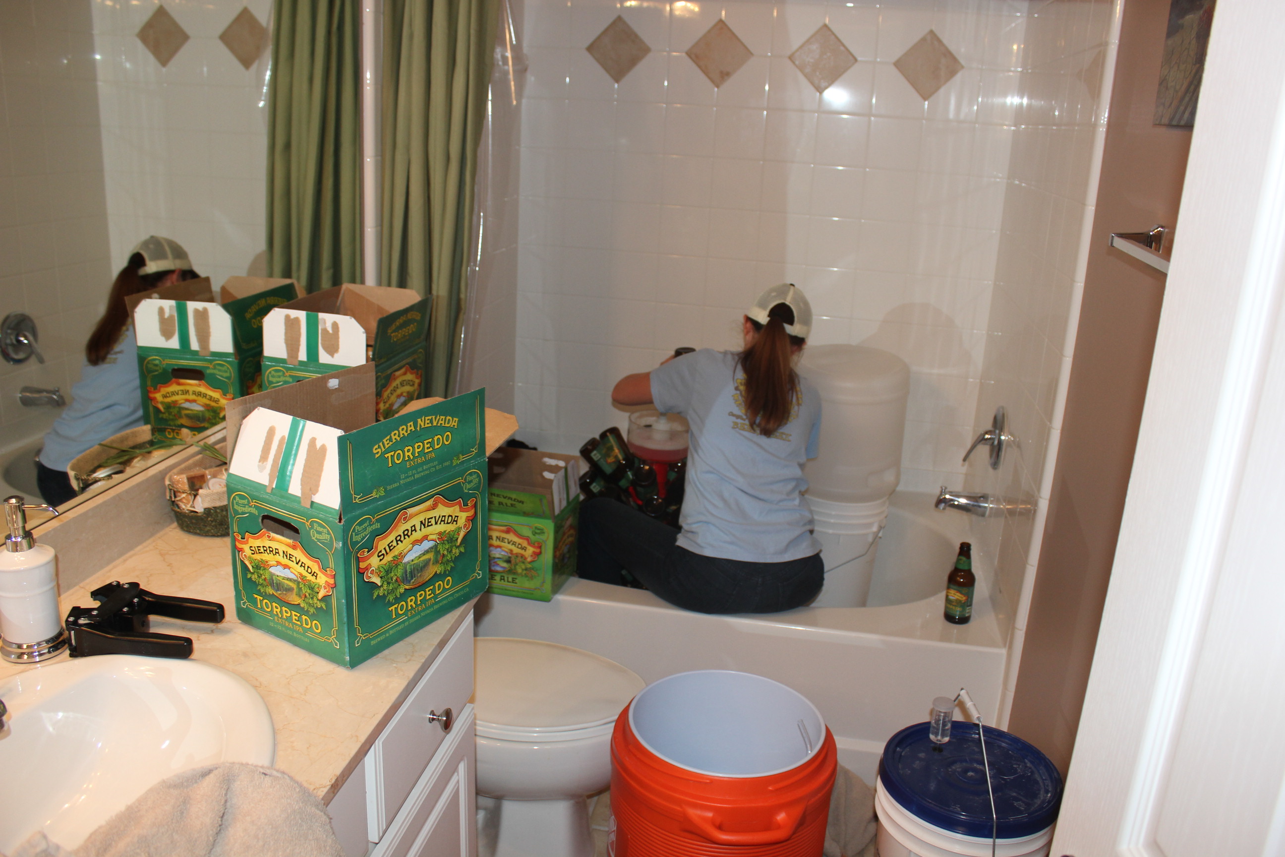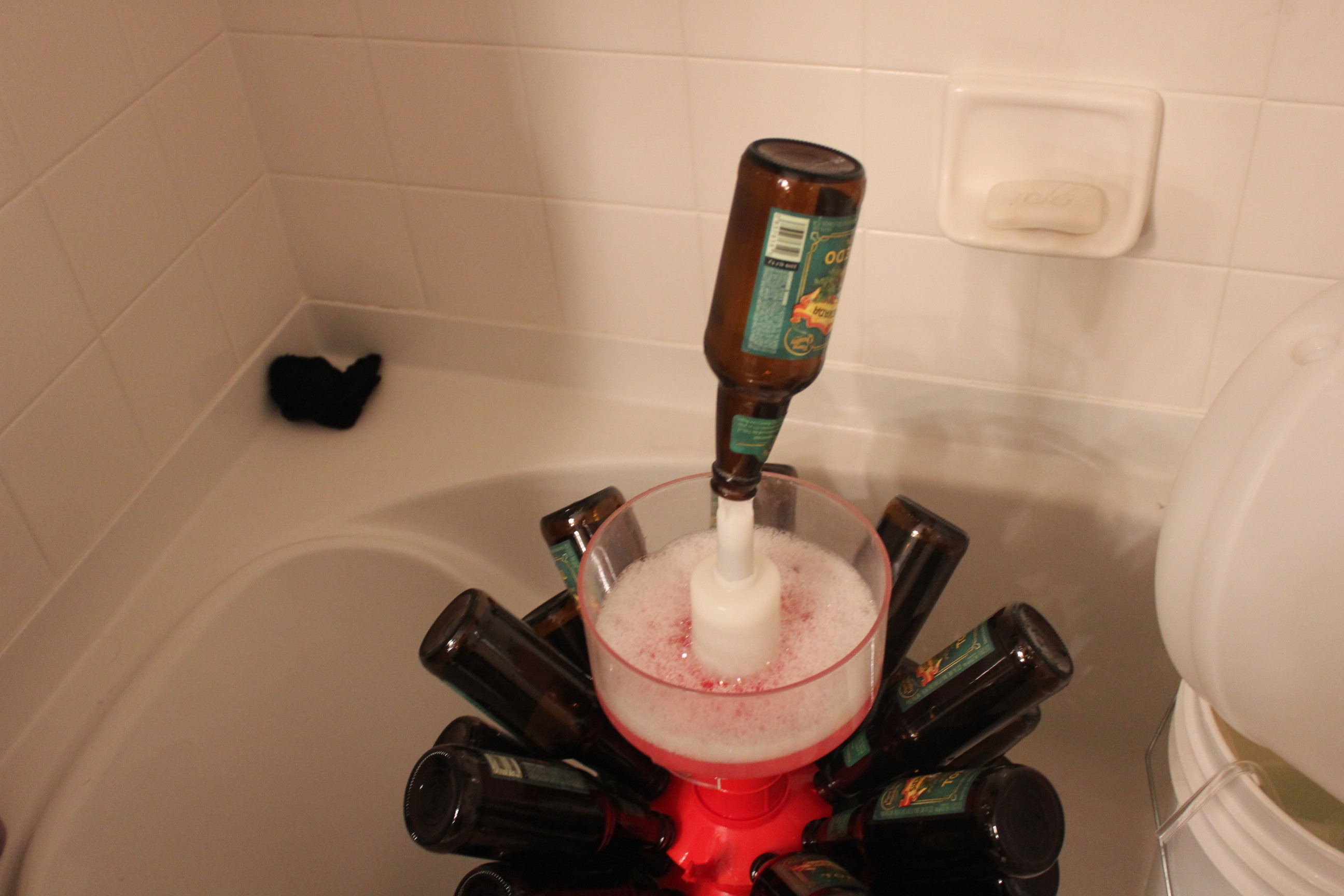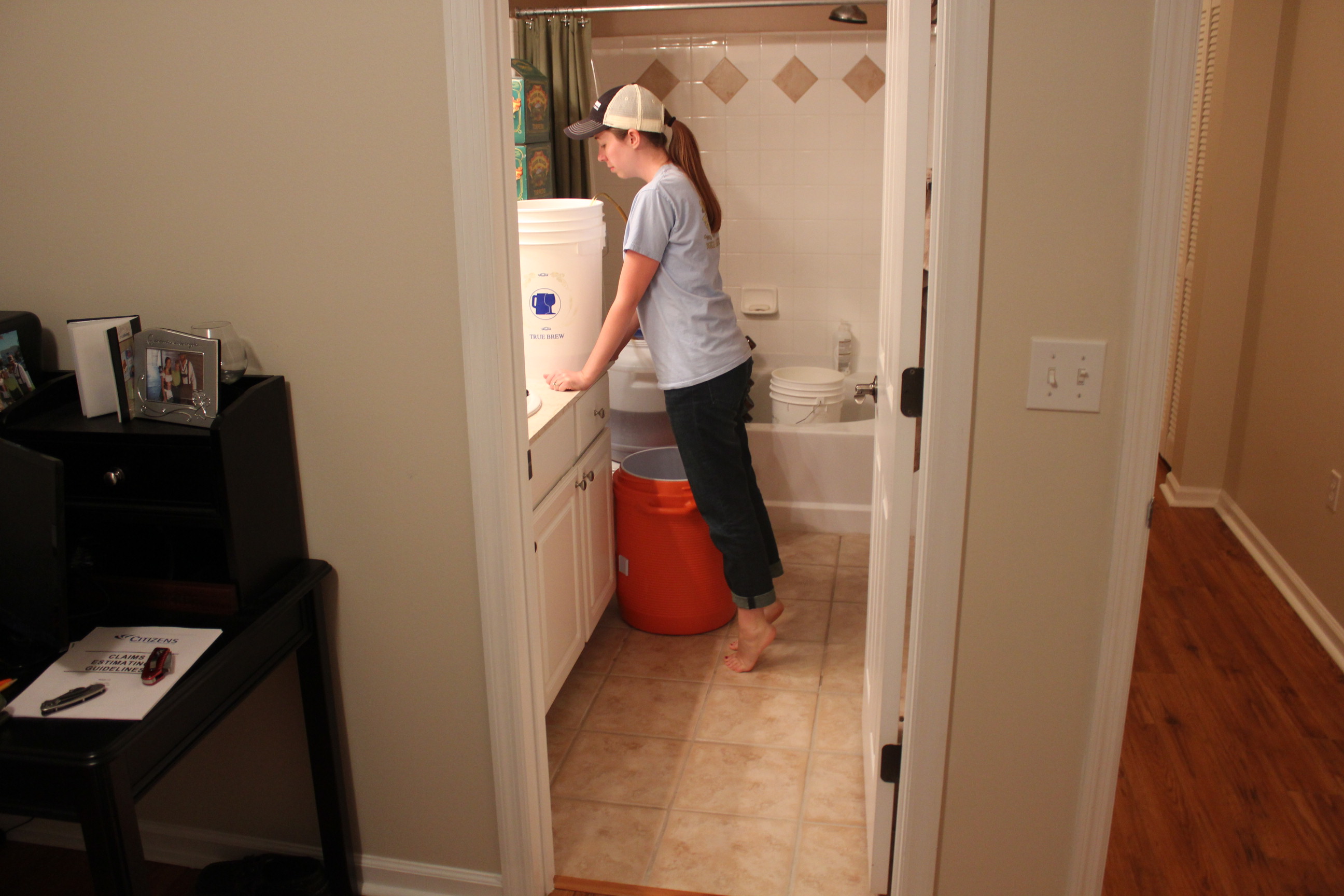 After cleaning ALL OF THE BOTTLES, it was time to transfer the beer into a bottling bucket. And yes I did this in the bathroom. Yes it was clean, and trust me I’m not the only one.
