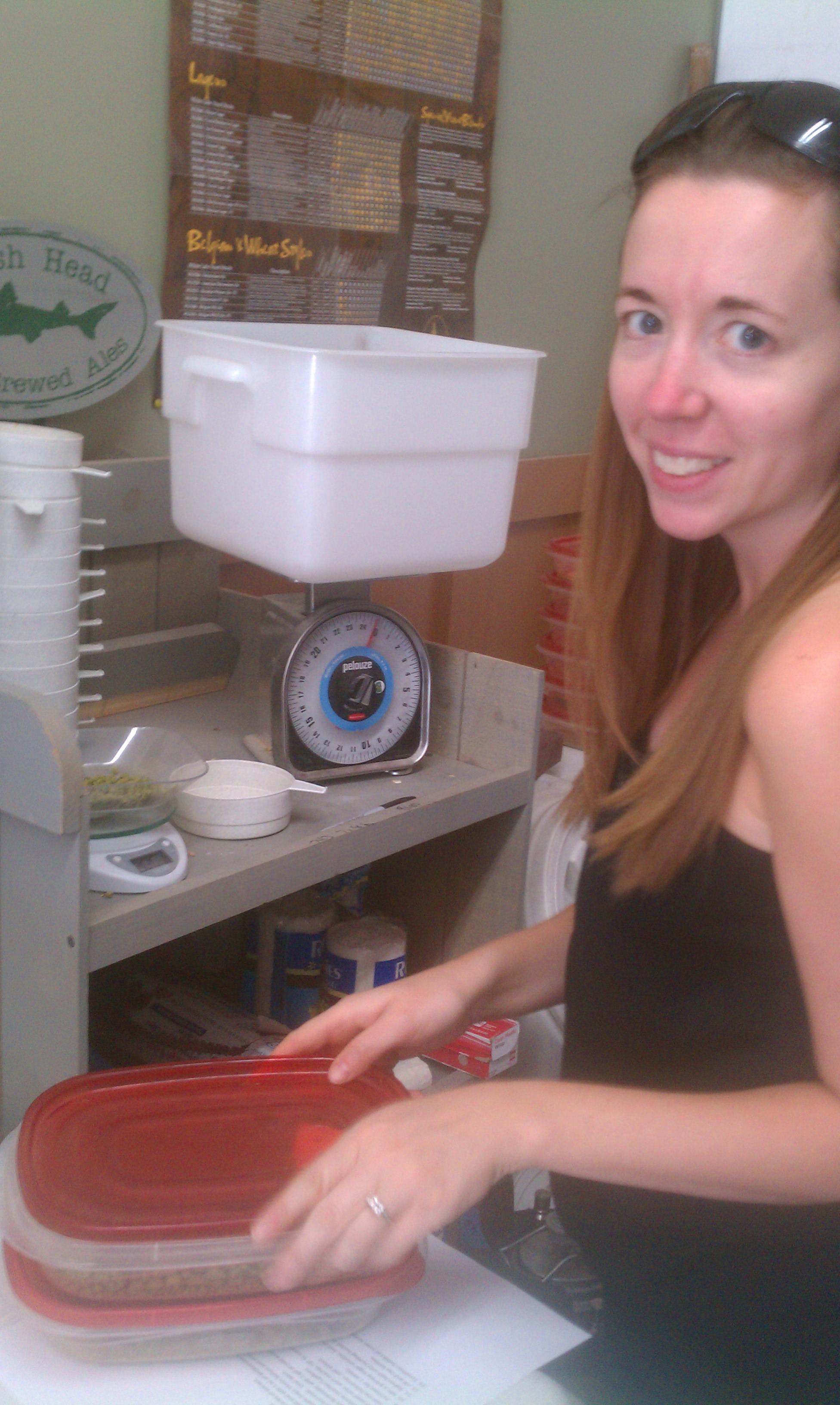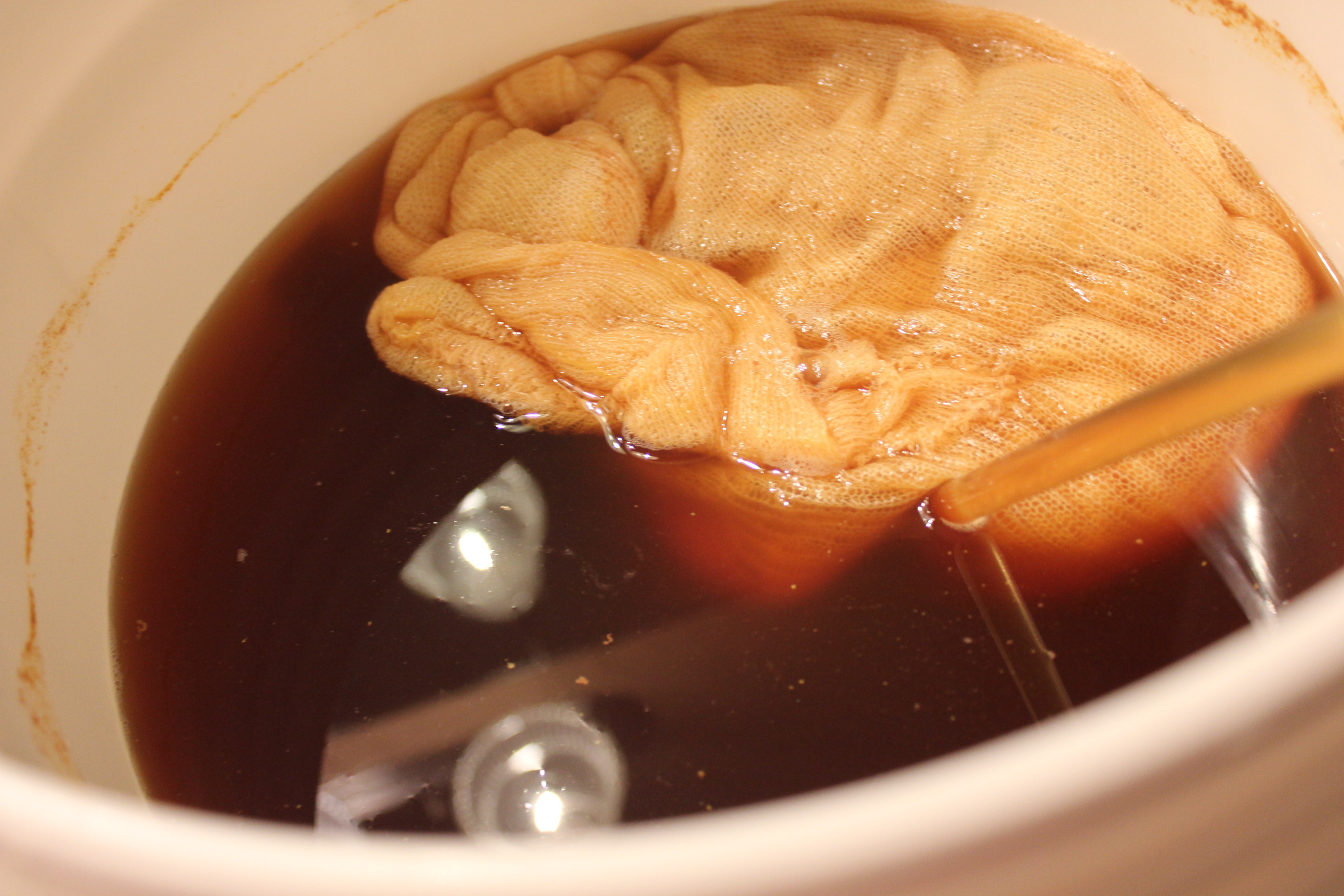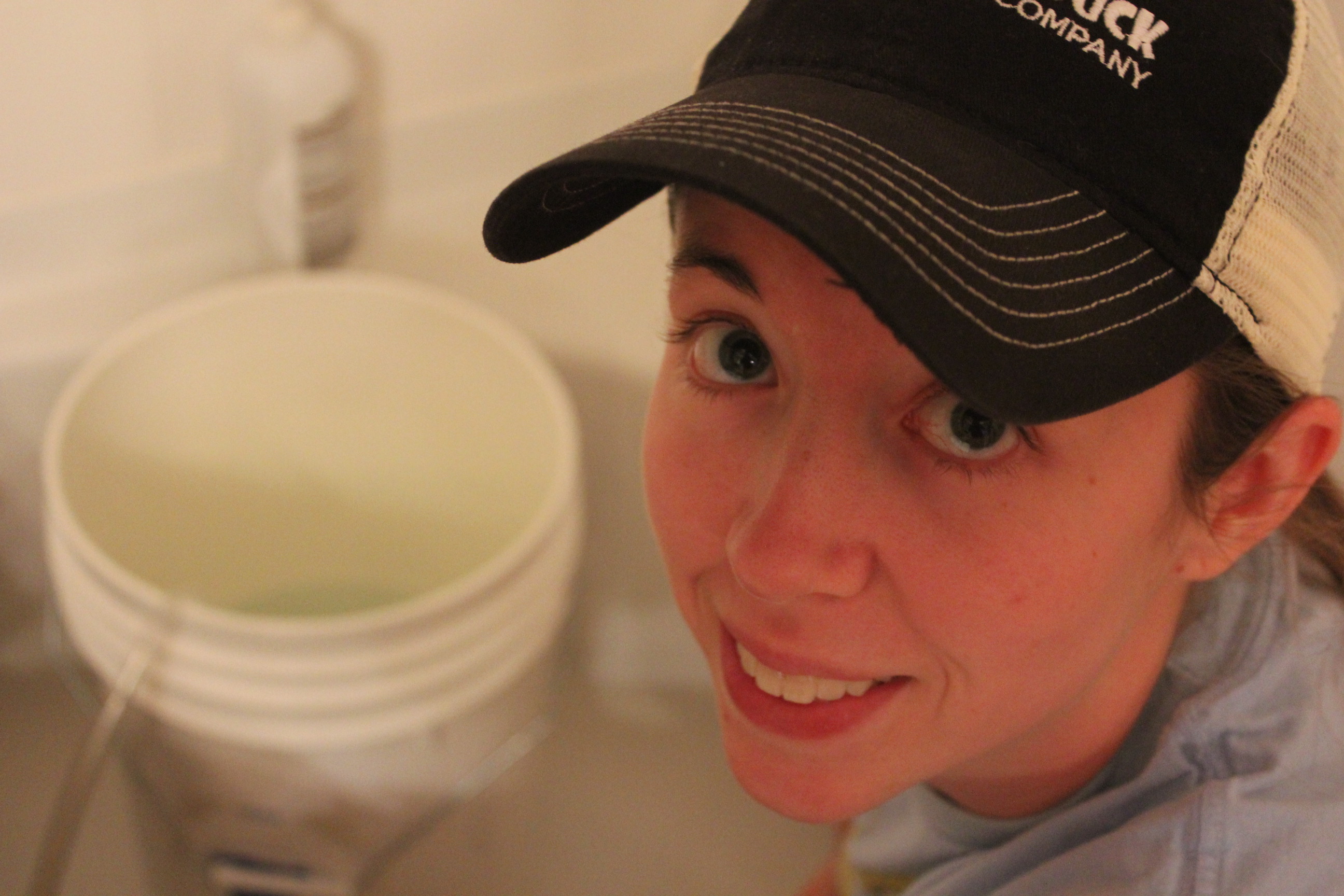 Once the beer cooled to 68 degrees, Huck transferred the 5 gallons of liquid into a fermentation bucket, and we “pinched the yeast” or added yeast to the beer. I placed the top on and placed the bucket in the guest bath tub for 1 week.