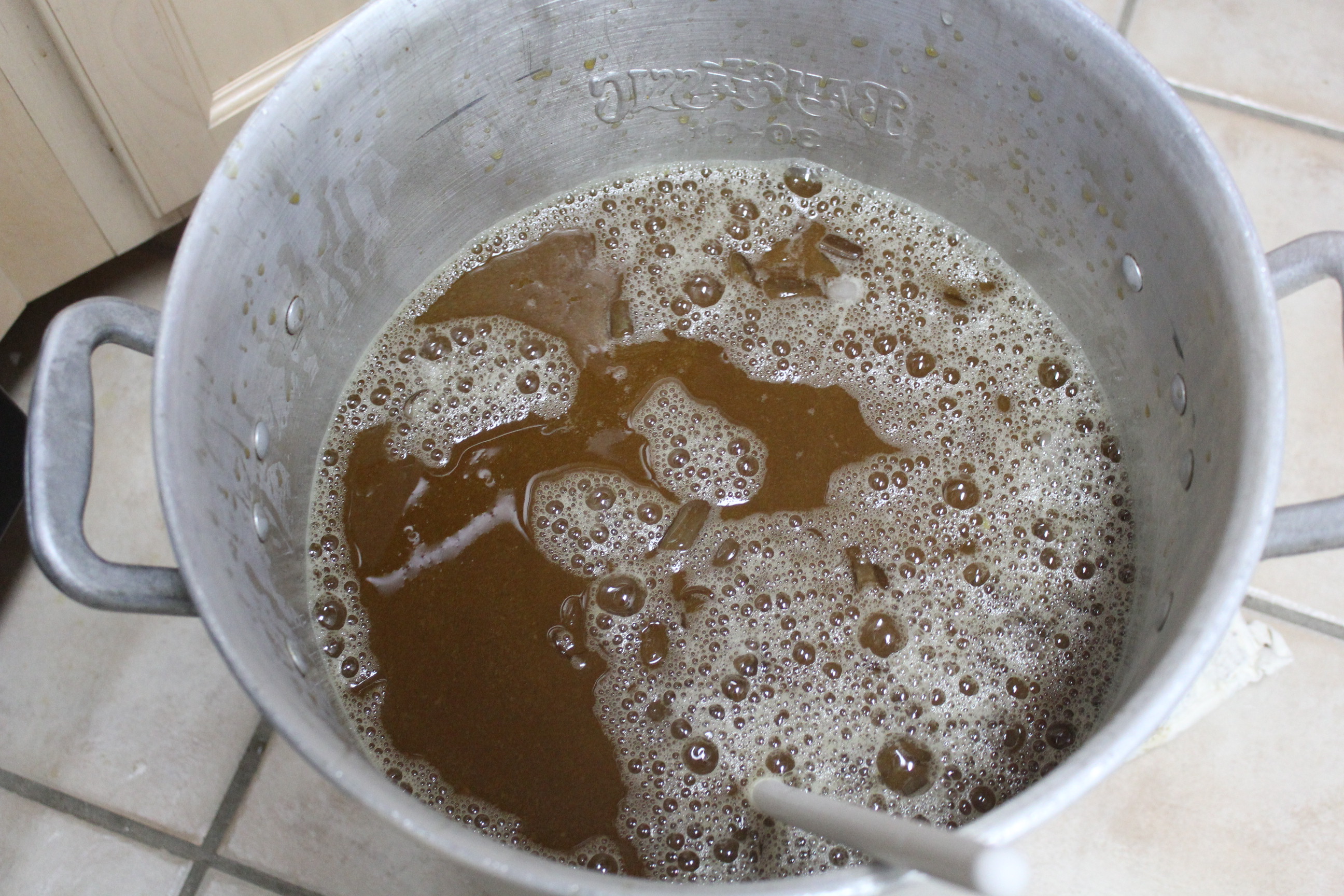 We arrived home, and I changed into my beer clothes and started boiling 2.5 gallons of water on the stove. Once that came to a rolling boil (2 hours later), I added the extract to the water stirring to make sure it did not settle on the bottom.