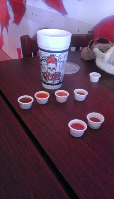 Everyone goes to Tijuana Flats for the Hot Sauce Bar. It is Huck’s favorite part. My sissy hot sauce was much hotter than my tear jerker. I think they got them confused.