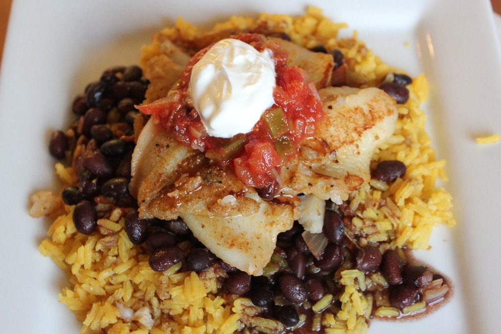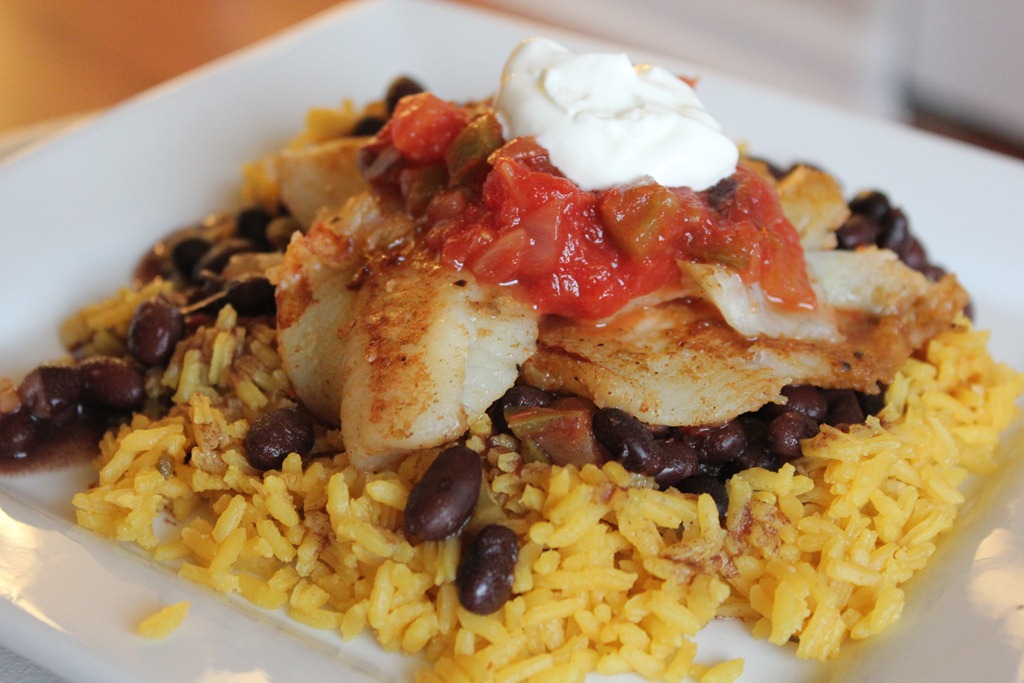For this recipe, I used canned Black Beans and spiced them up with some Jalapenos, onion, and garlic. For the rice, I used my recipe for Easy “Spanish” Rice, and the fish was seasoned with Salt Free Cajun Seasoning, Ground Jalapeno Powder (My new favorite thing), and Salt and Pepper. I heated up a large pan over medium-high heat and sprayed it with Non-Stick Cooking Spray. Make sure you do not crowd the pan with fish or it will lower the heat and you will not get a good sear on the fish. I served mine with extra salsa and sour cream. Huck said the sour cream ruined the picture, but I like sour cream and I think it looks great!!