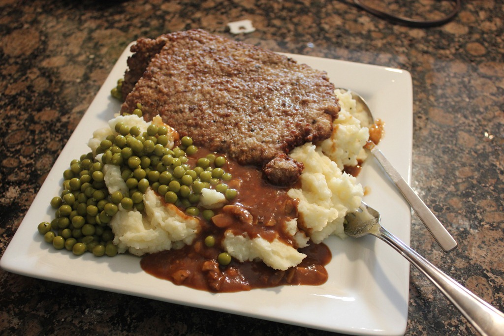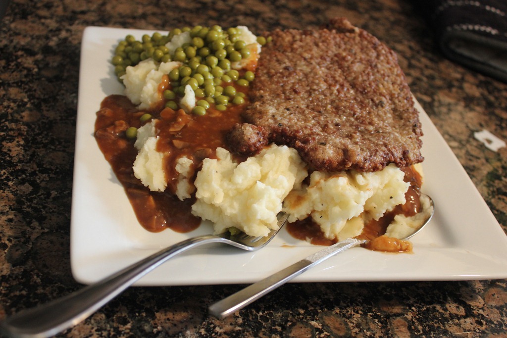 Last night I did two things I never do! I ate dinner before 6 and fried something. Huck has been asking for Country Fried Steak for dinner for awhile now. This meal was something I grew up eating. Me, my mom, or Sister would make this on special occasions. My mom makes her homemade biscuits with hers. I’m not that good.