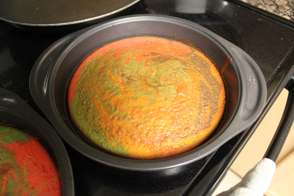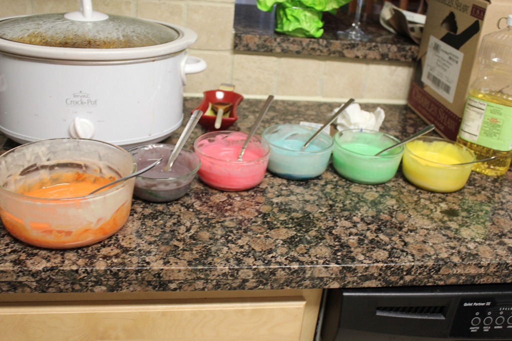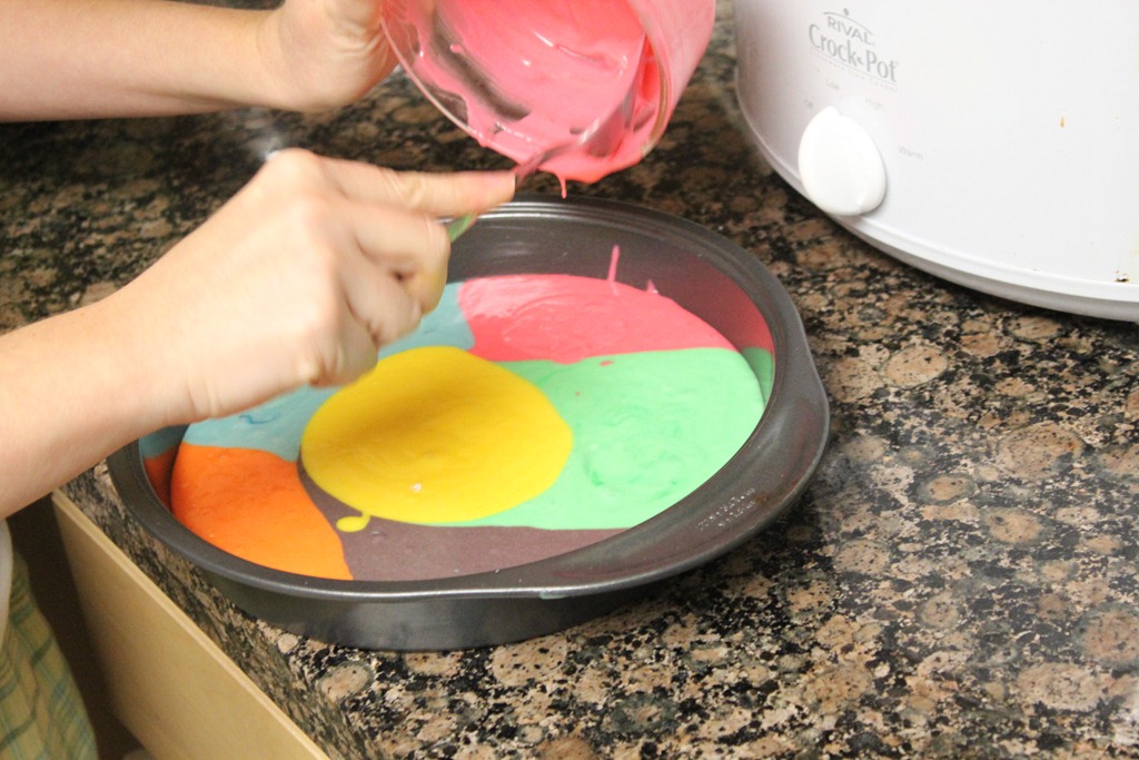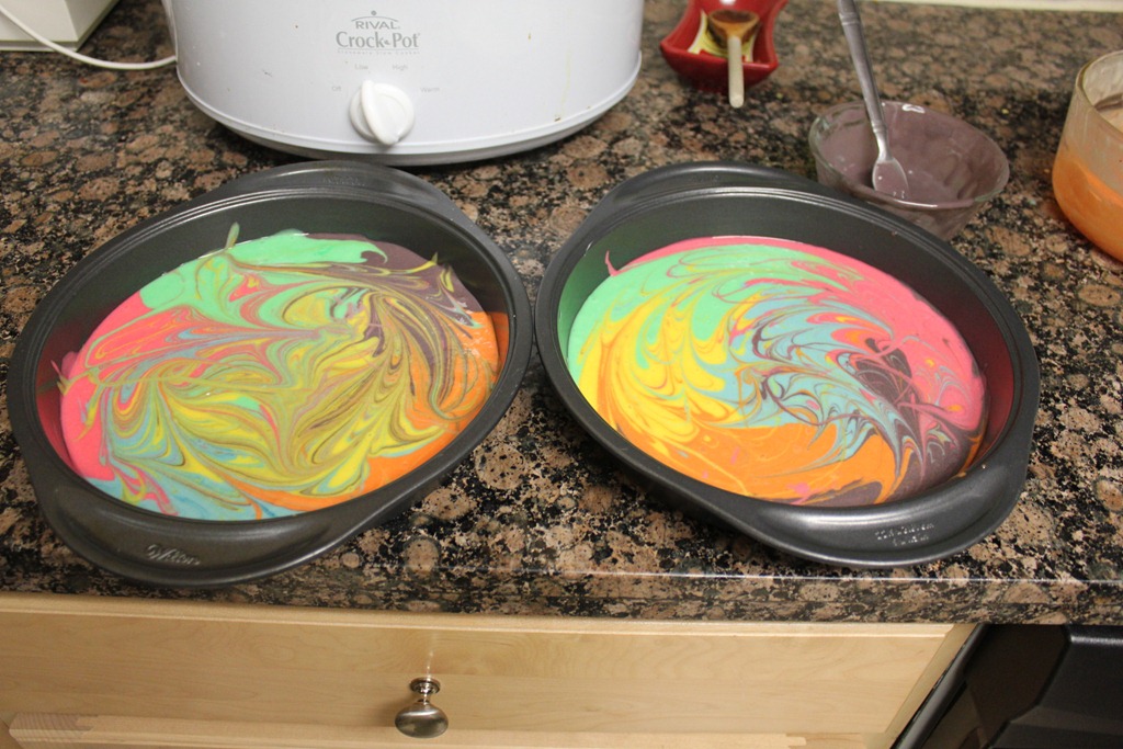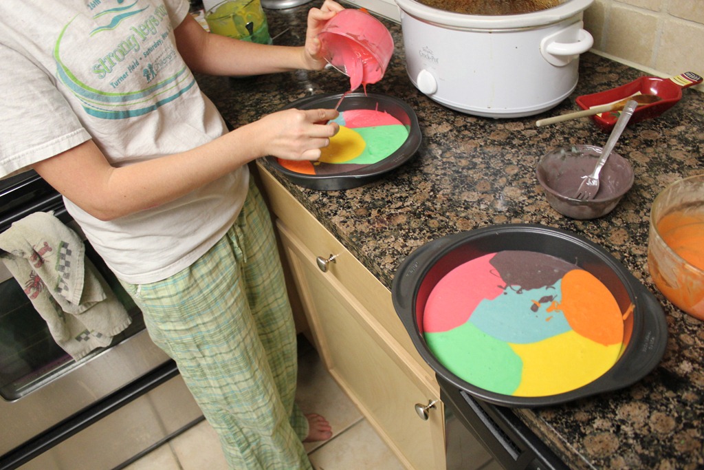 We added half of each color into our baking pan. (Yes, I still had my PJ pants on. I’m sick!! I have an excuse