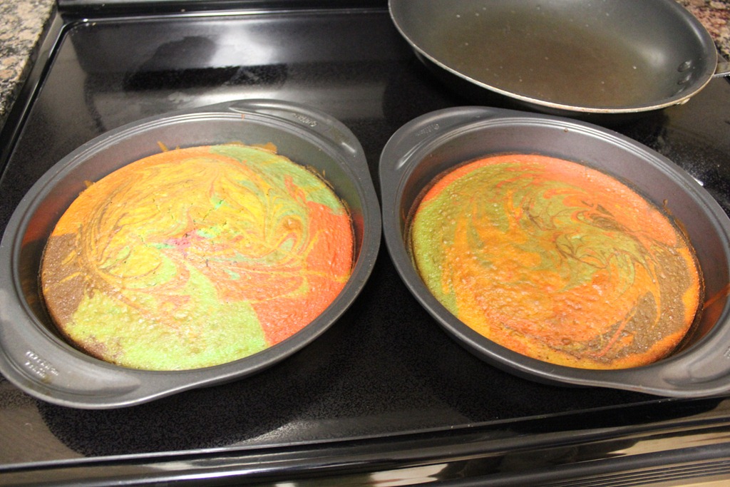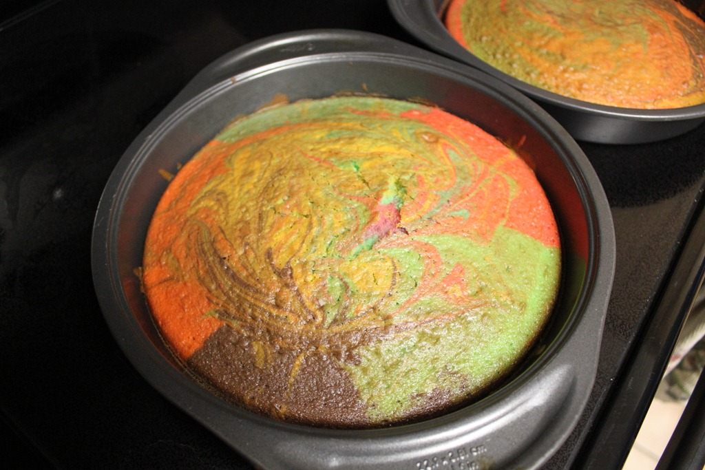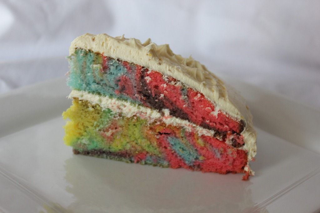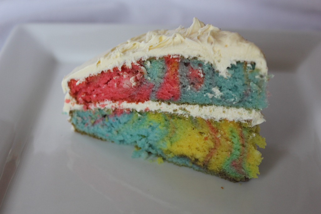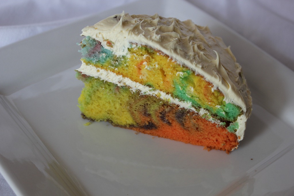 What you are left with is a tie-dyed cake! I wish we would of done cupcakes instead, though. Then I could give them to our neighbors, and I wouldn’t be left with a whole cake in the house. I may still take them a couple slices. Huck will only eat a few slices, and you can’t waste cake!