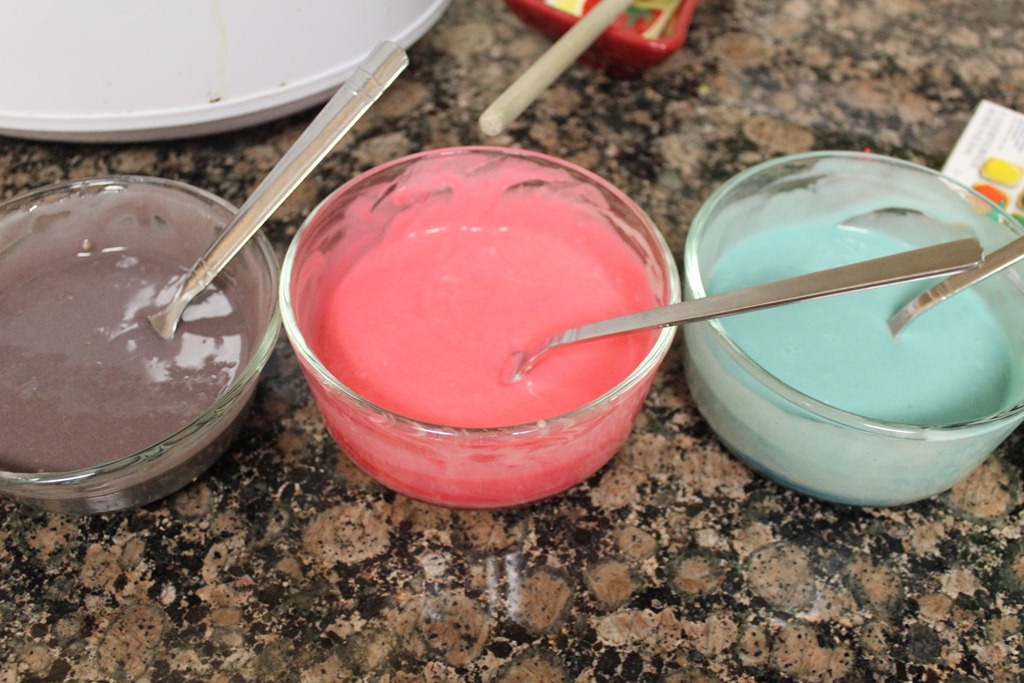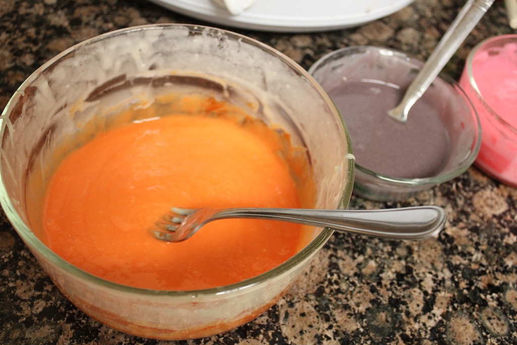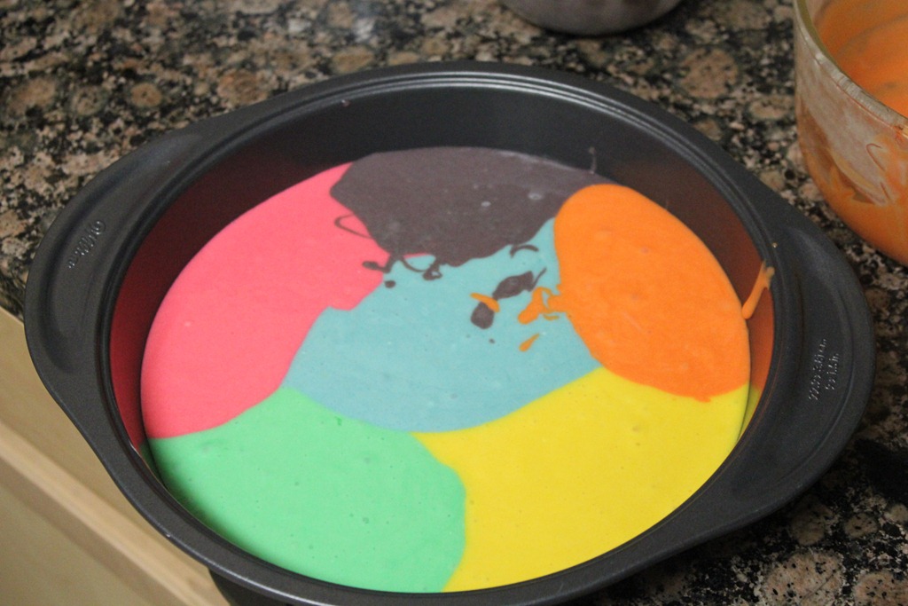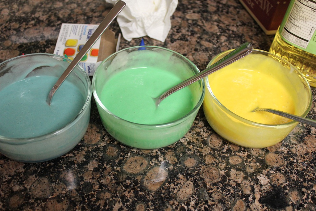 Huck and I took a box of plain white cake mix and divided the cake among 6 bowls. Then, we added food coloring to each one.