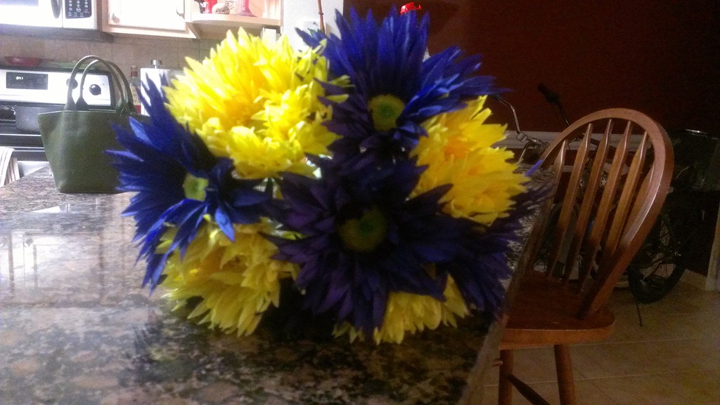 I found some blue flowers, like the ones I used for the bridesmaid bouquets. I mixed a few yellow and blue together. I think I like it. The yellow is a lighter color than the other flowers. I’m still thinking about it. I thought about even going flowerless.