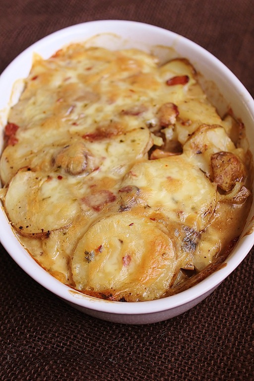 A few days ago, I had potatoes, mushrooms, and random pieces of leftover cheese in my fridge. I decided to made Scalloped Potatoes, but realized, I did not have milk. I was stuck on Scalloped Potatoes, so I added some random ingredients together and came up with something way better!