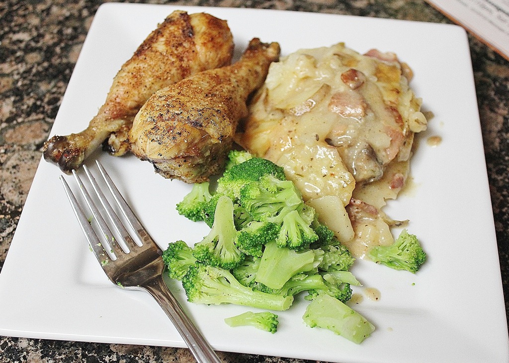 I served dinner with Chicken and Broccoli. Huck and I finished off the whole pan of potatoes though. The different cheeses really made the difference! Or maybe it was just the bacon. Either way it was yummy!!