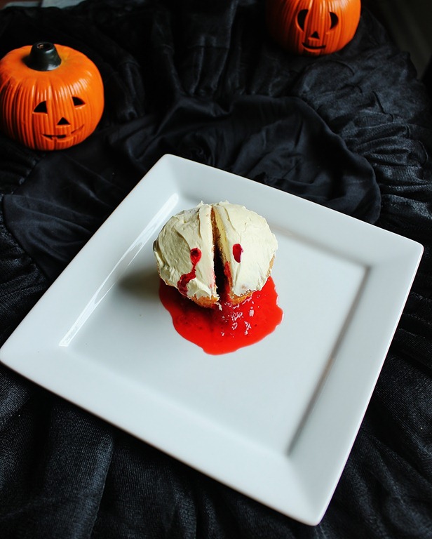 Spooky Vampire Cupcakes are super easy to make. I used a regular box caked mix and my favorite jarred strawberry jam. They’re the perfect addition to any Halloween party!