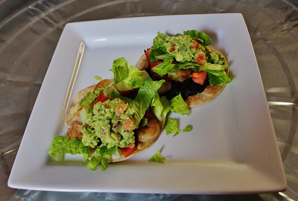 - Serve shrimp over crispy tortillas with homemade Guacamole, Black Beans, Lettuce, and Tomatoes.