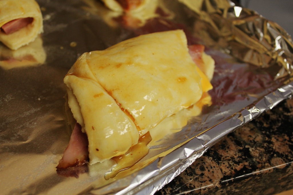 Preheat oven to 350 degrees. Lay crescents on a cutting board, and top larger end with slice of ham and cheese. Roll crescents up starting at the larger end. Place on a baking sheet that is sprayed with non-stick cooking spray. Brush with glaze to cover top. Bake for 12-15 minutes. Allow to cool for a few minutes before removing from foil. Serve hot.