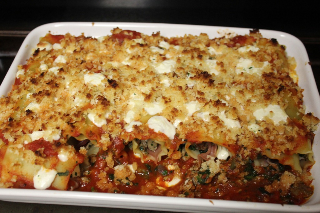 Lay lasagna noodle on board. Place Prosciutto on one end. Spread about two tablespoons of meat mixture across noodle and top with cheese. Start at the end with prosciutto and roll. Some of the meat will fall out. Place pasta in baking dish, seam side down.