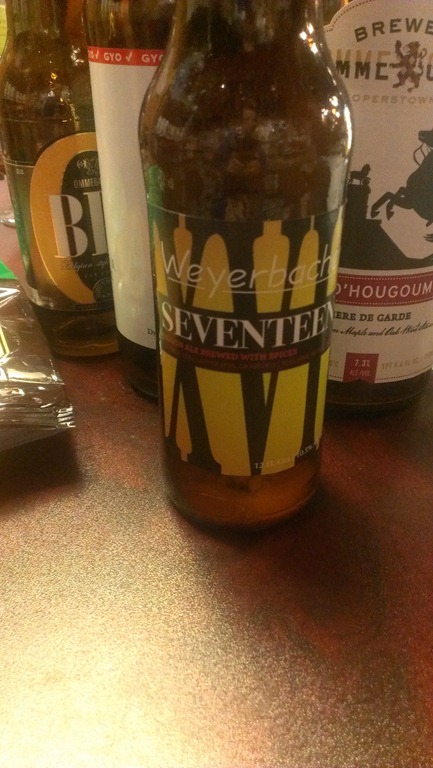 This weeks beer is Seventeen from Weyerbacher. Seventeen is a Saison Ale brewed with Pink peppercorns, Orange Zest, Lemon Zest, and Grapefruit Zest. This beer is a whopping 10.5% abv (abv = Alcohol by Volume. FYI Bud Light is 4.2%)