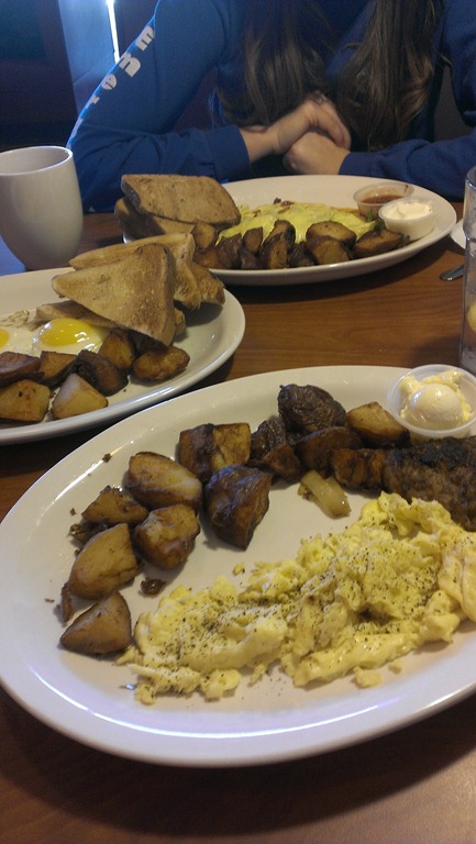 They gave Huck the wrong order of eggs, and instead of bring him just the eggs, he got a whole new order. Fine with me; I was hungry!!