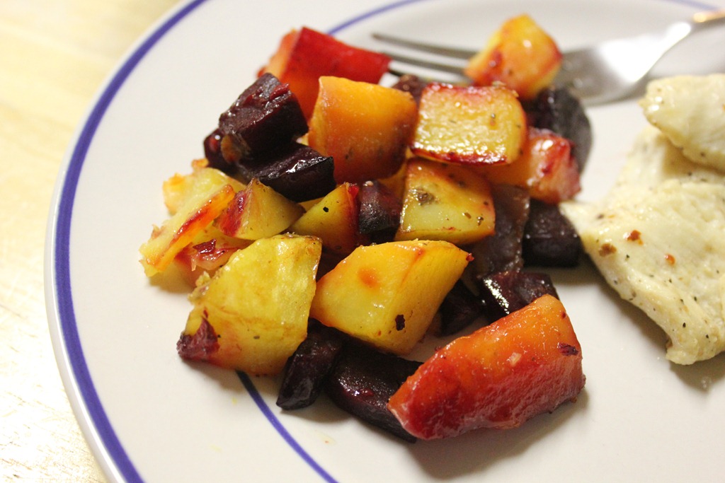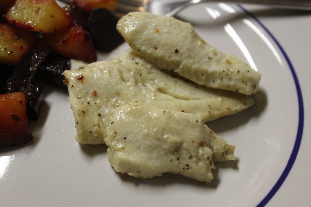 Lisa roasted some root veggies, and I sautéed the fish with some Salt, Pepper, Crusted Red Pepper, and Lemon.