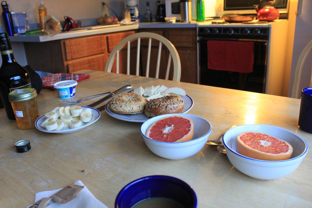 We enjoyed our coffee with Grapefruit, Banana, Apples, Cheese, and Bagels with Pineapple Habanero Jelly and Goat Milk Cream Cheese. The Pineapple Habanero Jelly was amazing. Lisa bought it at the Hot Sauce store at the Mall of America.