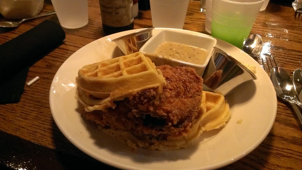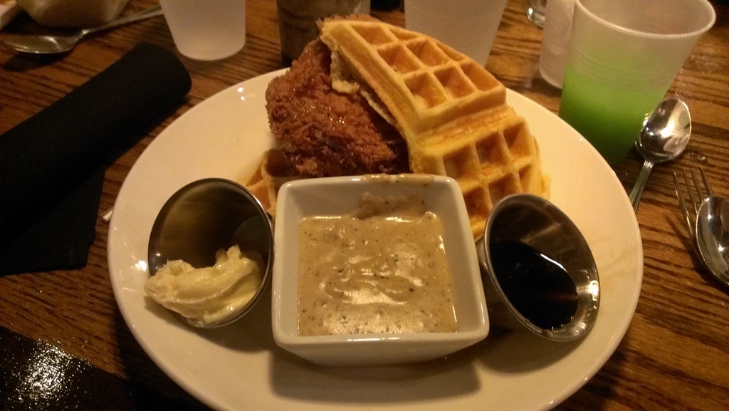 Huck and I decided to split the Chicken and Waffles. The chicken had a Honey and Vanilla glaze on it, and the gravy was spicy. It made a great combination.