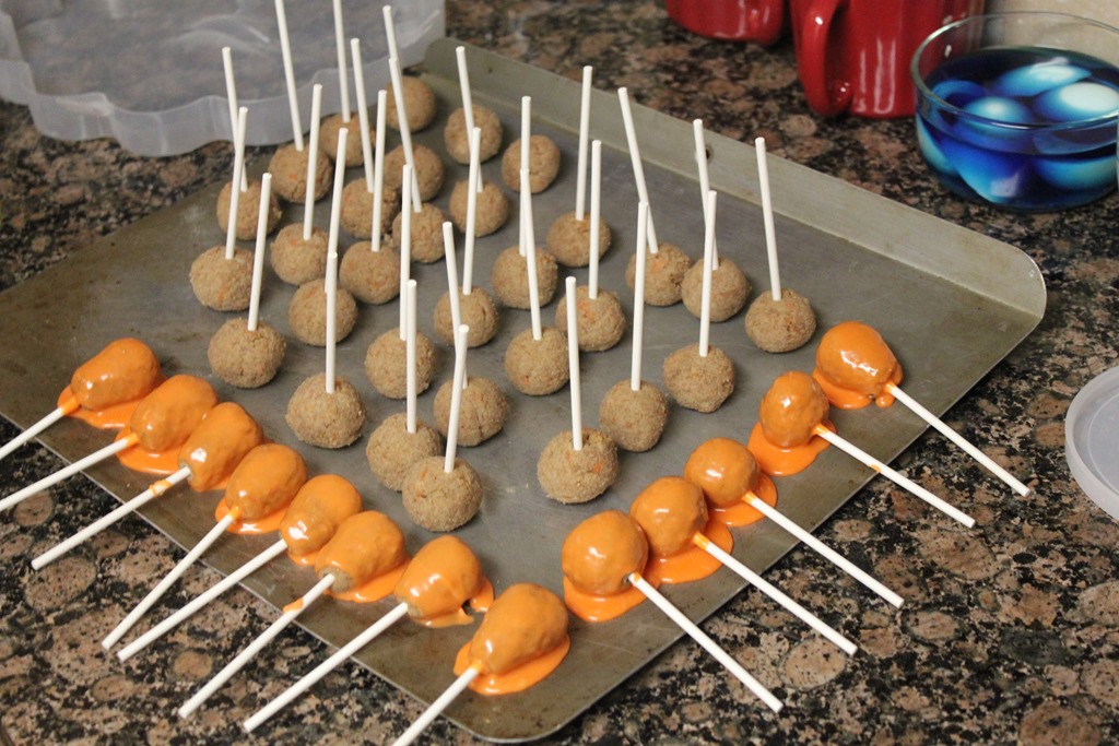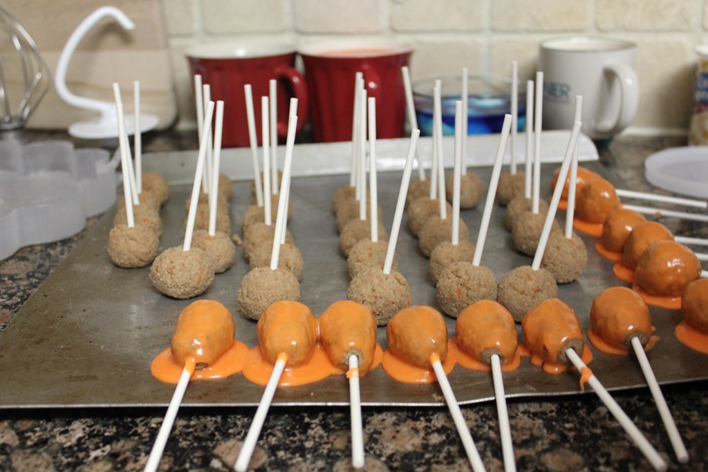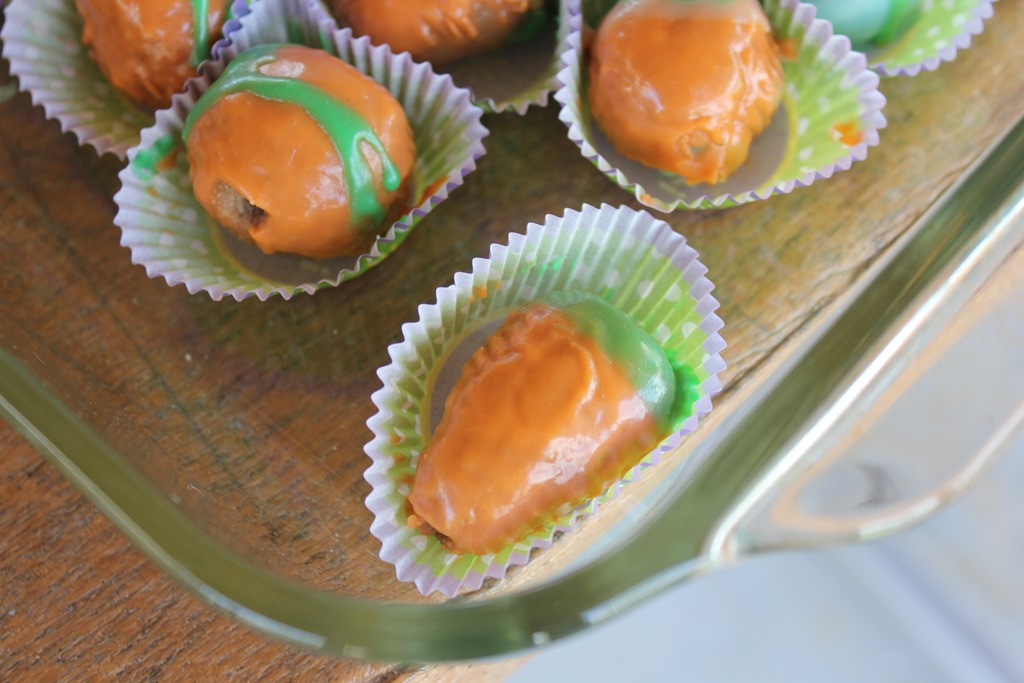 I shaped some into balls and others into carrot. I dipped the “carrots” in the orange white chocolate and dipped the tops in green.