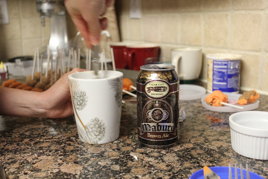 The melted chocolate was a little to thick, so I added beer to help thin it out. It made coating the balls easier.