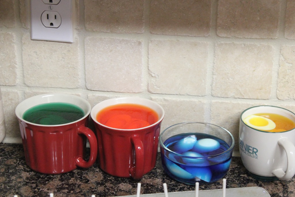While working on the Cake pops, i soaked the white part of the hard boiled eggs in a mixture of food coloring and water.