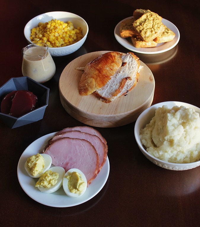 I made Turkey, Potatoes, Dressing, Ham, Gravy, and Deviled Eggs. Scaled down versions of everything of course.