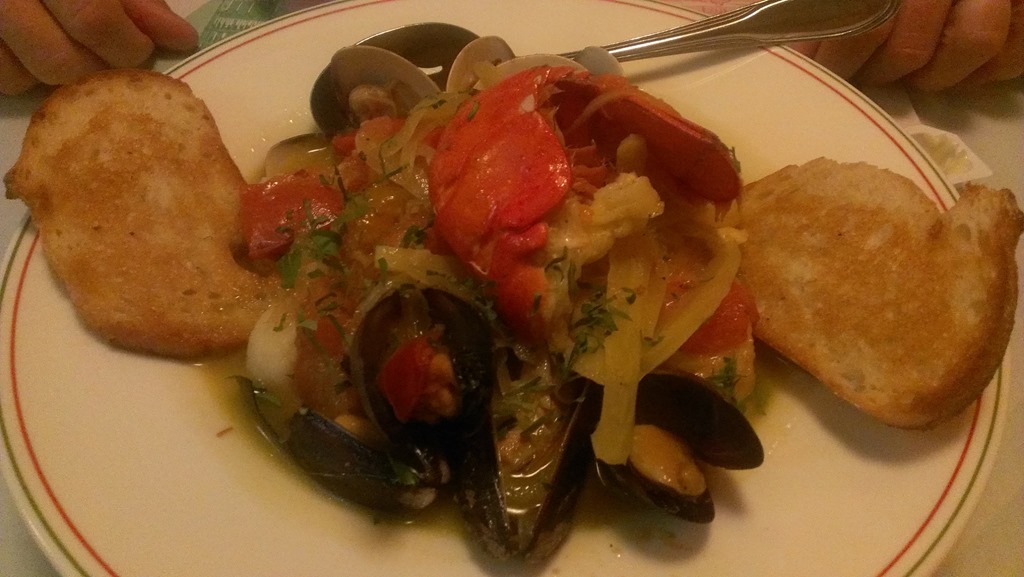 Amazing!! We both agreed it was delicious! All the seafood was cook perfectly, and the broth had great flavor. It was served with Red Snapper, Scallops, Mussels, Clams, Lobster, Shrimp, and Potatoes. All the good stuff.