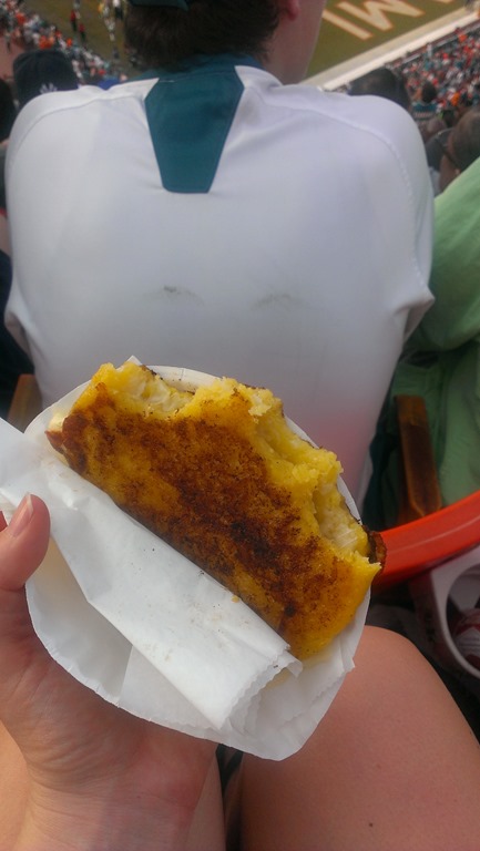 Felix bought us an Arepas. Good greasy stadium food.