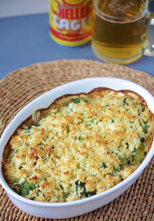 Brussels Sprouts Gratin with Beer, Bacon, and Cheese. Yummy!! I actually made this for Christmas dinner and everyone loved it. We’ll, I think everyone loved it. There wasn’t any left, and I got lots of compliments.