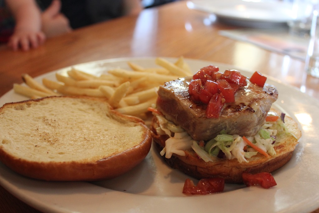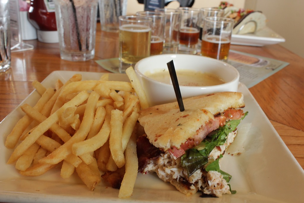 Once we were seated at A1A Ale Works, we ordered a couple of flights, and everyone ordered something different for the menu. I went with the Crab BLT and A1A Cheese Soup, Huck ordered the Fish Tacos, and Chris and Lisa split a Ahi Tuna Burger. My sandwich was overflowing with crabmeat. Huck’s tacos were great, but the Tuna was hands down the best! Yum!
