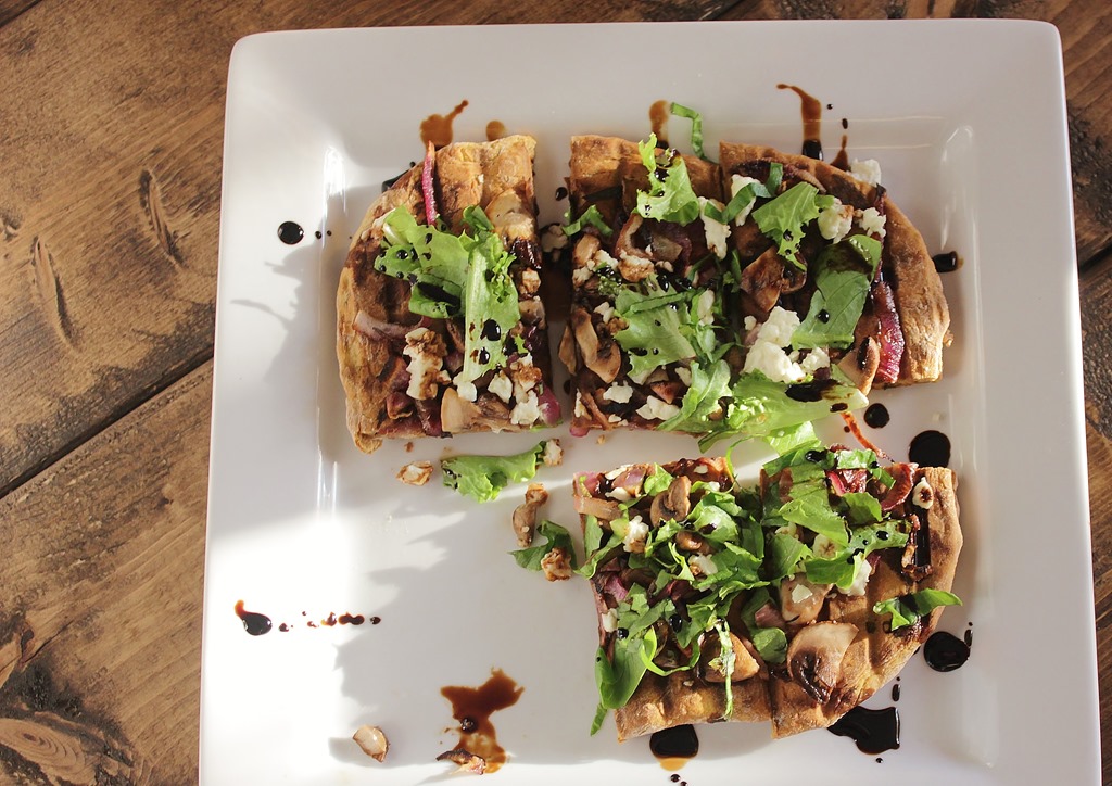 Grilled Beer Flatbread topped with Caramelized Onions, Mushrooms, Arugula, and Feta.