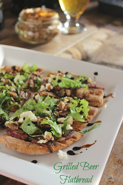 We normally stick with traditional pizza favors {cheese, pepperoni, and veggies}. Last night, I decided to change it up some. Recently, I tried a flatbread with Gorgonzola, Caramelized Onions, and Arugula. I wanted to recreate those flavors at home with a this Grilled Flat Beer Bread. I decided to skip the Gorgonzola and used Feta. It’s a strong flavor that can overpower your dish. The Feta has a light flavor that paired well with light flavor beers. With the combo of sweet onions and earthy mushrooms, this was a winner. A drizzle of balsamic vinegar completed the dish.