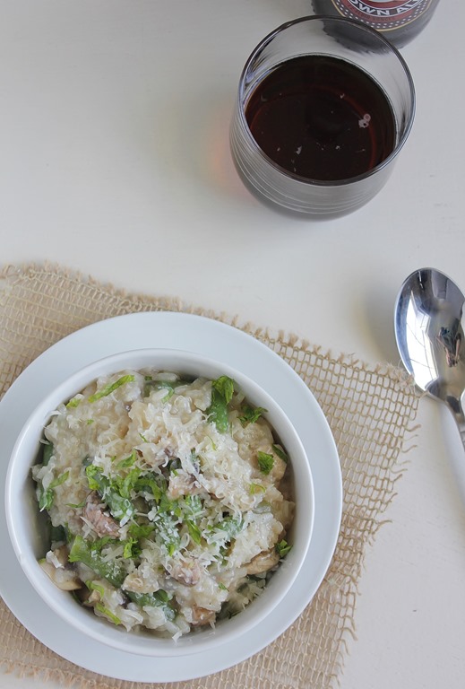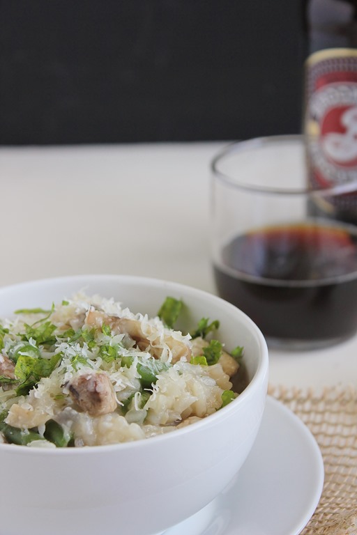 For this recipe, I used Brooklyn Brewery Brown Ale. This is a great brown ale and added great flavor to the risotto. The roasted flavors worked well with this savory dish. The sweetness also helped balance the saltiness from the cheese and chicken stock. You can substitute extra stock for the beer if you’d like to leave the beer out.
