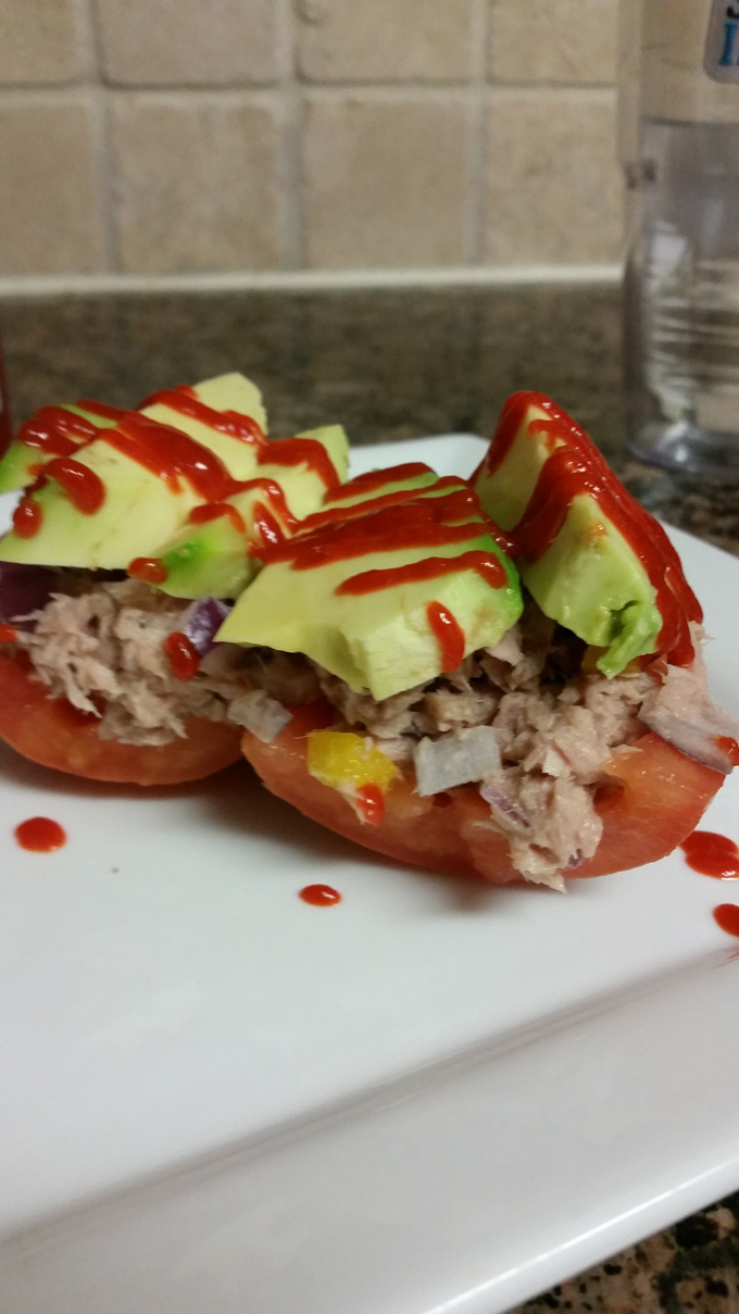 Jan 22th- Dinner for one. {Skinnytaste Canned Tuna Ceviche served on a roma tomato and topped with a ridiculous amount of Sriracha}